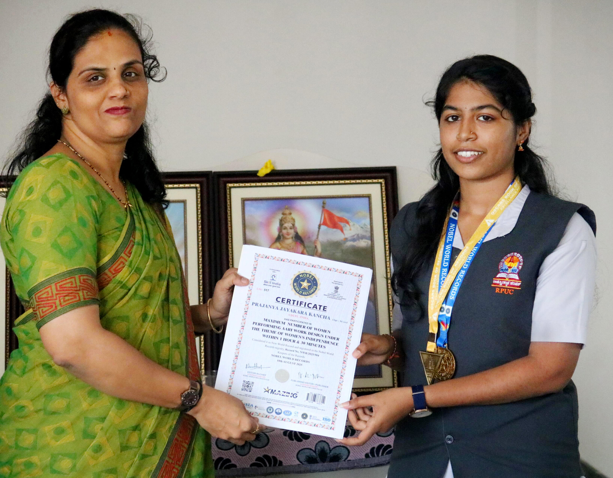 Keshavanagar: Rashtrotthana Pre-University College – Udupi’s 1st PU Science Student, Prajanya Jayakar Kanchan, has received the Nobel World Record Certificate and Medal, the Oscar Book Records Certificate and Membership of the World Aari Organization.